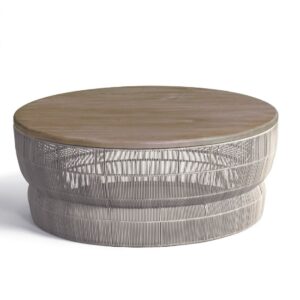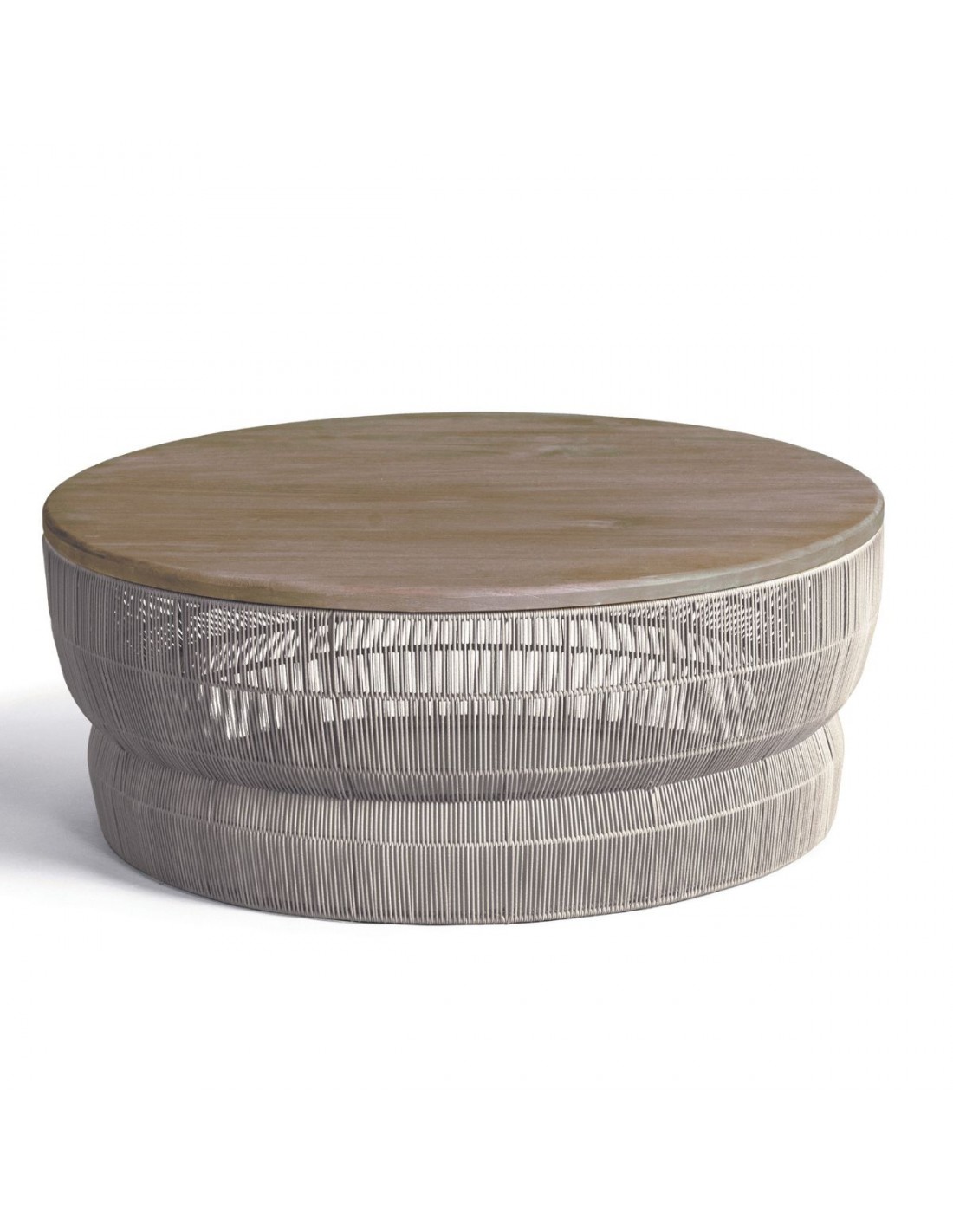 Mesa de centro redonda para exterior con sobre de madera de teca y base de ratán sintético en color piedra. Cómbinala con la mesa auxiliar modelo DEBORA para crear ambiente de jardín o porche. Pieza con base de rejilla que aporta ligereza a la pieza.