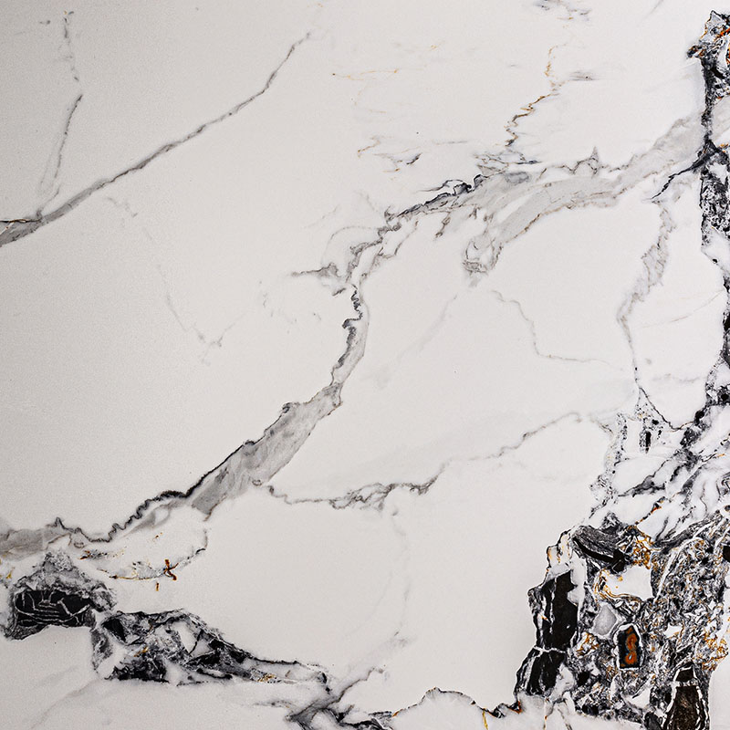Mesa comedor Astach de estilo art deco fabricado en porcelánico en color blanco combinado con acero en color oro. Producto desmontable.