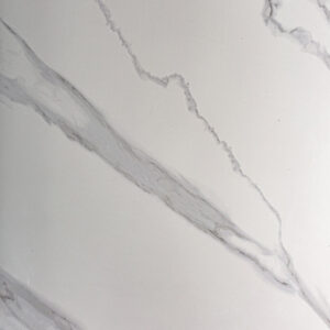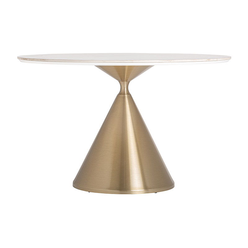 Mesa comedor freyung de estilo art deco fabricado en porcelánico en color blanco combinado con acero en color oro. Producto desmontable.