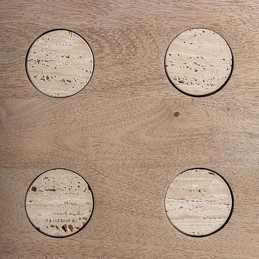 Mesa comedor Jacquard de estilo contemporáneo fabricado en madera de mango en color marrón claro combinado con travertino en color marrón. Producto desmontable.
