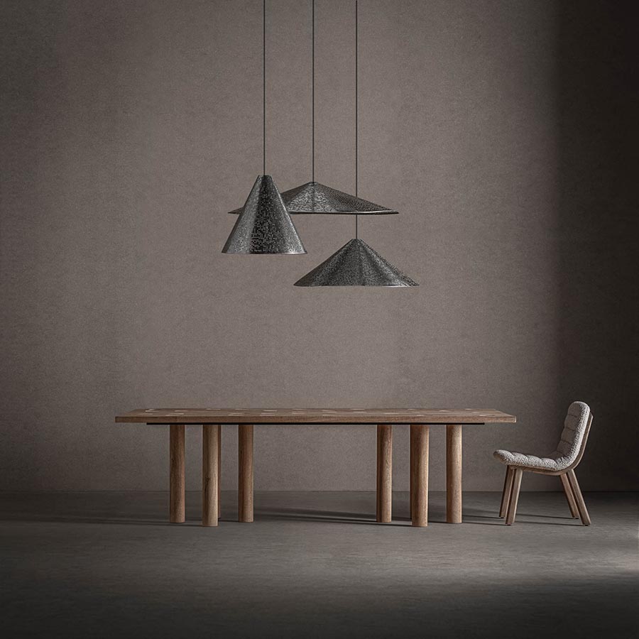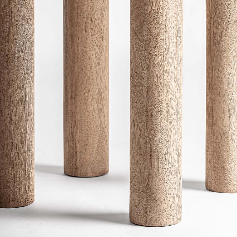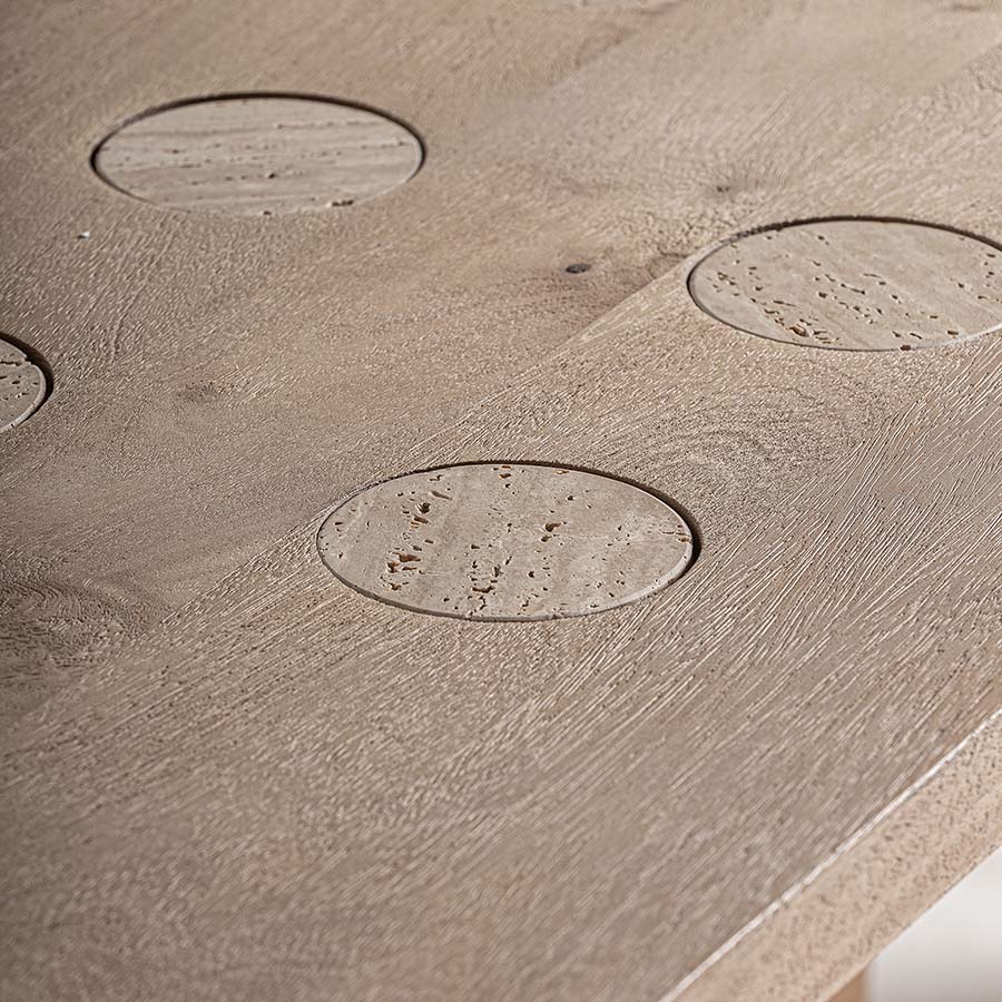 Mesa comedor jacquard de estilo contemporáneo. Fabricado en madera de mango en color marrón claro combinado con travertino en color marrón. Producto desmontable.