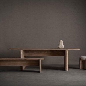 Mesa comedor jacquard de estilo contemporáneo fabricado en madera de mango en color marrón claro. Producto desmontable.