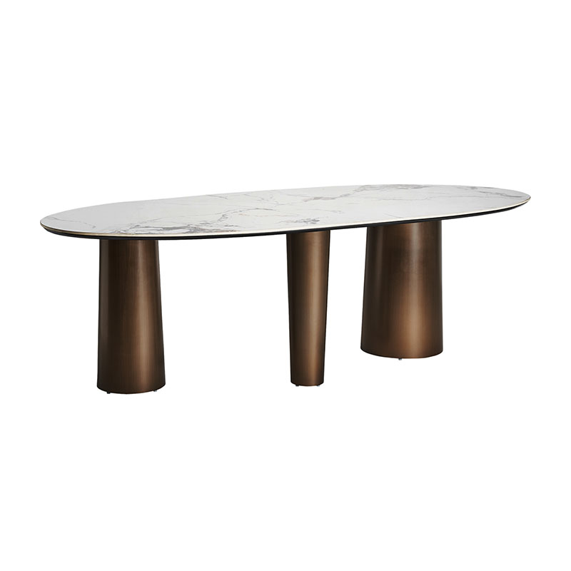 Mesa comedor Laggan de estilo art deco fabricado en acero en color bronce combinado con porcelánico en color blanco. Producto desmontable.