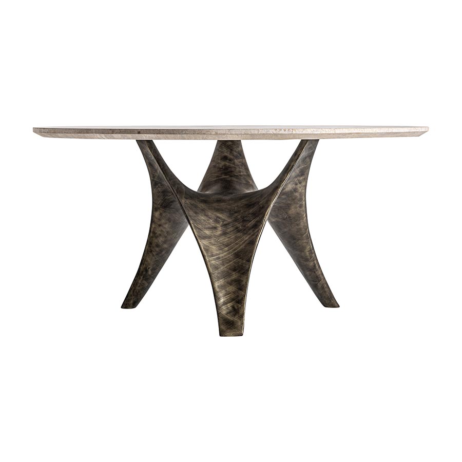 Mesa comedor Laize de estilo art deco fabricado en travertino en color beige combinado con acero inoxidable en color oro con acabado viejo. Producto desmontable.