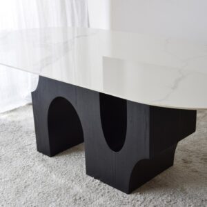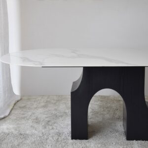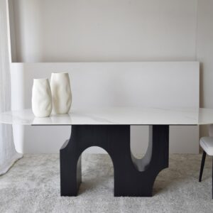 MESA DE COMEDOR PETRA CON SOBRE REALIZADO EN MATERIAL CERÁMICO DE 12 MM DE ESPESOR DE ACABADO MÁRMOL EN COLOR BLANCO VETEADO EN TONOS GRISES. LA BASE ESTÁ FORMADA POR UNA PIEZA DE DISEÑO ESCULTÓRICO A LA QUE APORTA GRAN LIGEREZA EL VACÍO DE LOS HUECOS QUE LA ATRAVIESAN. REALIZADA EN DM RECHAPADO EN FRESNO NATURAL TEÑIDO EN COLOR NEGRO DE ACABADO MATE QUE DEJA VISTA LA VETA PROPIA DE LA MADERA. LOS TONOS Y PATRONES DEL MATERIAL UTILIZADO EN EL SOBRE PUEDEN SER DIFERENTES DE UNAS PIEZAS A OTRAS.CERÁMICO N1
