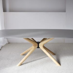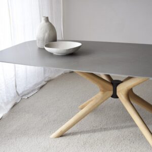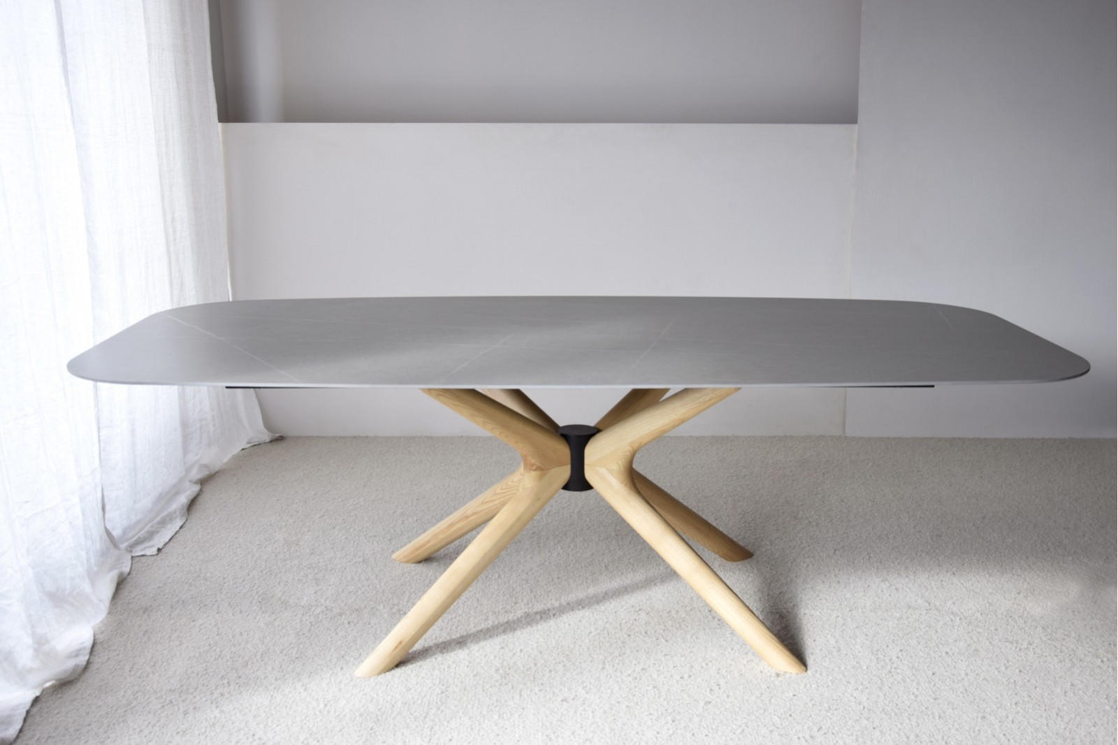 MESA DE COMEDOR PIEDRA CON SOBRE REALIZADO EN MATERIAL CERÁMICO DE 12 MM DE ESPESOR DE ACABADO EN COLOR GRIS MATE CON VETAS BLANCAS. EL PIE ESCULTÓRICO DE LA MESA ESTÁ REALIZADO EN MADERA MACIZA DE FRESNO ACABADO NATURAL APORTANDO DISEÑO Y SENSACIÓN DE LIGEREZA A TODA LA PIEZA. DE ESTILO CONTEMPORÁNEO EL USO DE MATERIALES CON ACABADO MATE CONVIERTE A ESTA MESA EN UN OBJETO DE ESTÉTICA URBANA Y FRESCA PERFECTO PARA CUALQUIER COMEDOR.LOS TONOS Y PATRONES DEL MATERIAL UTILIZADO EN EL SOBRE PUEDEN SER DIFERENTES DE UNAS PIEZAS A OTRAS.CERÁMICO N11