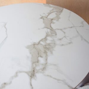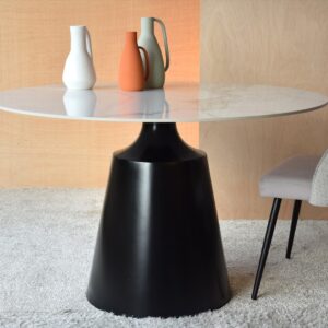 MESA DE COMEDOR REDONDA CON SOBRE REALIZADO EN MATERIAL CERÁMICO DE 13.5MM DE ESPESOR CON ACABADO MÁRMOL EN COLOR BLANCO VETEADO EN GRIS. LA BASE ESTÁ REALIZADA EN DM LACADO EN NEGRO MATE. MEDIDA PIE: Ø55CM/Ø35CMx H75CM.LOS TONOS Y DIBUJOS PUEDEN CAMBIAR EN CADA PIEZA DE MATERIAL CERÁMICO. CERÁMICO N1