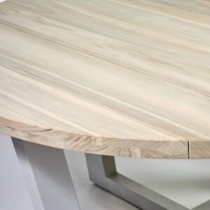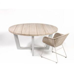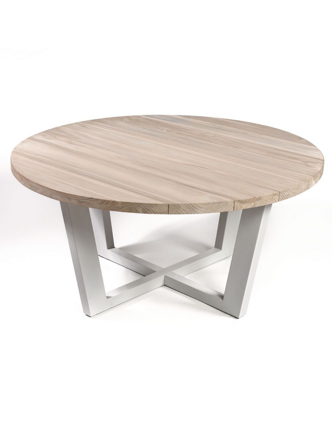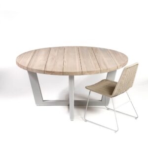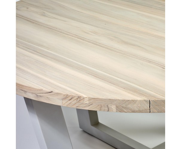 Mesa de comedor redonda con tablero de madera de teca apta para uso exterior o interior. Pata de metal color topo claro.