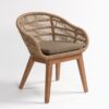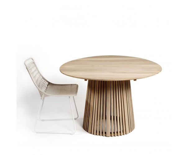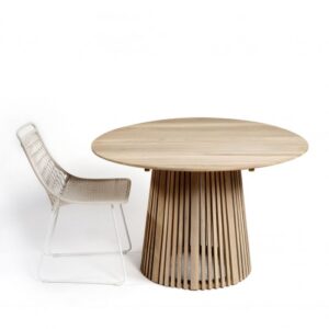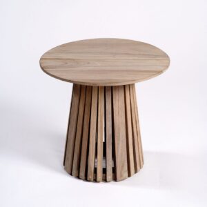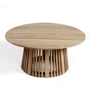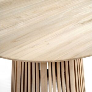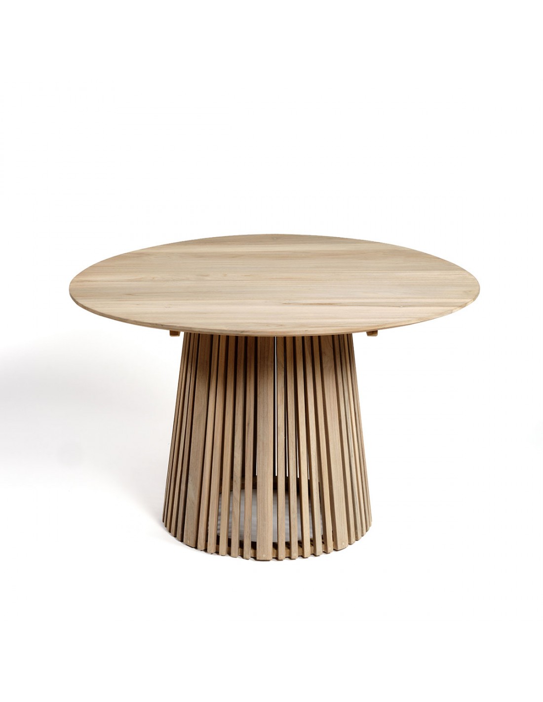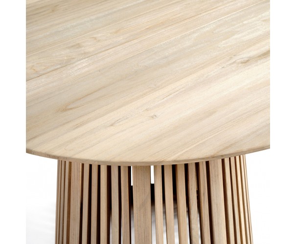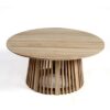 Mesa de comedor redonda para exterior de madera de teca envejecida con pie central de palillería. También disponible en distintas medidas de mesa de centro y mesas auxiliares.