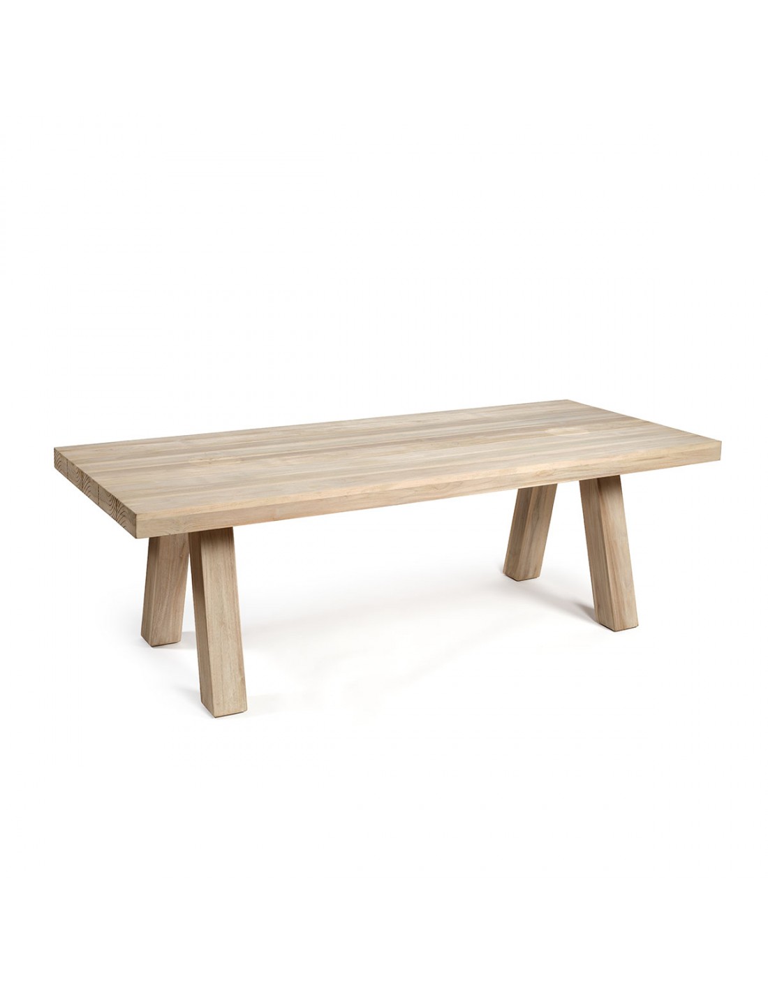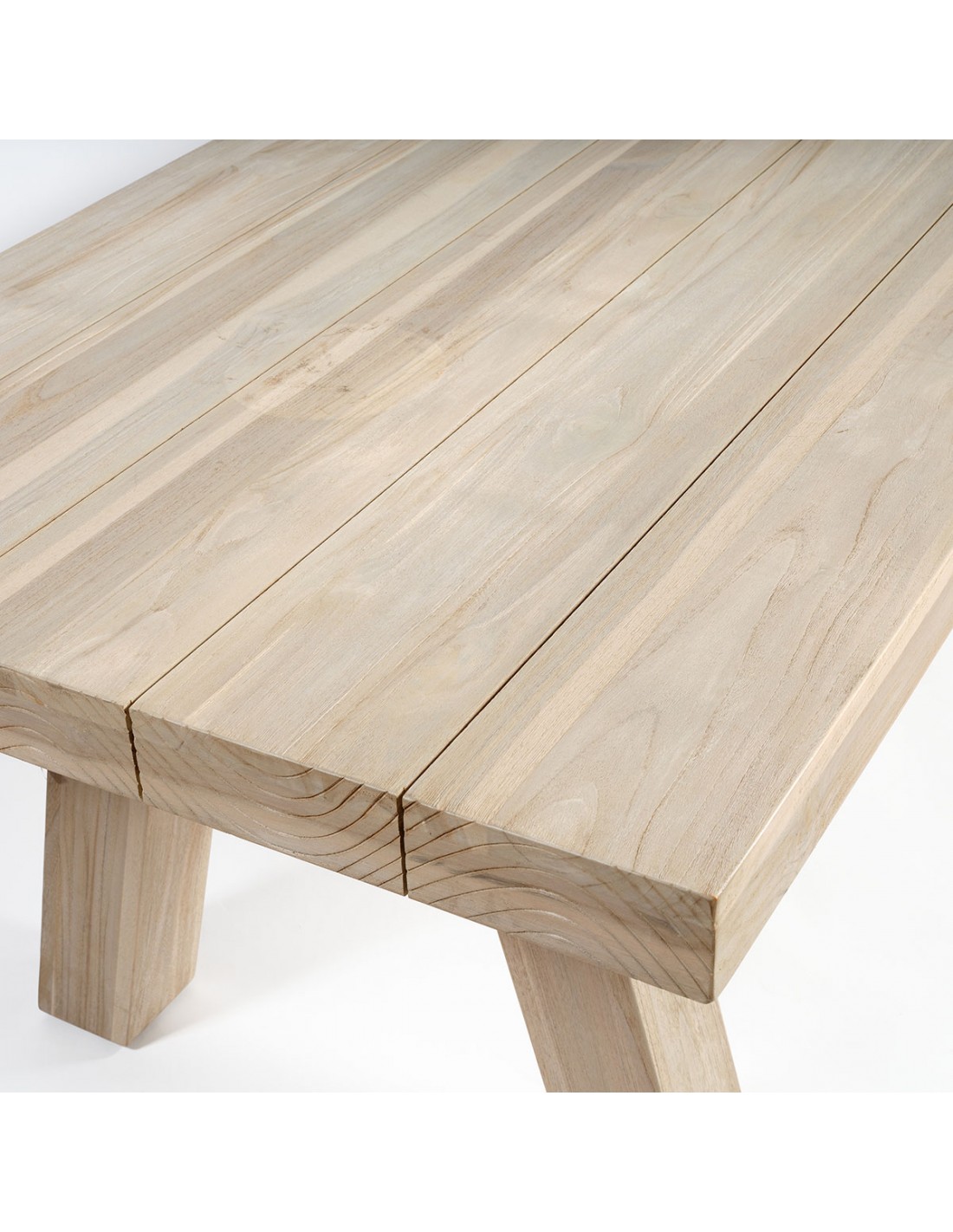 Mesa de comedor rectanguar de para de teca envejecida. Es apta para exterior. cuenta con patas en los extremos. El sobre hace efecto de listones de madera al dejar pequeñas separaciones entre sus tablas.