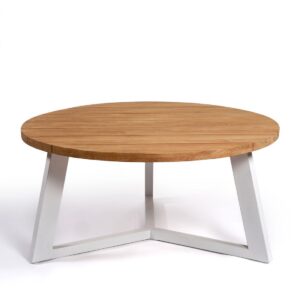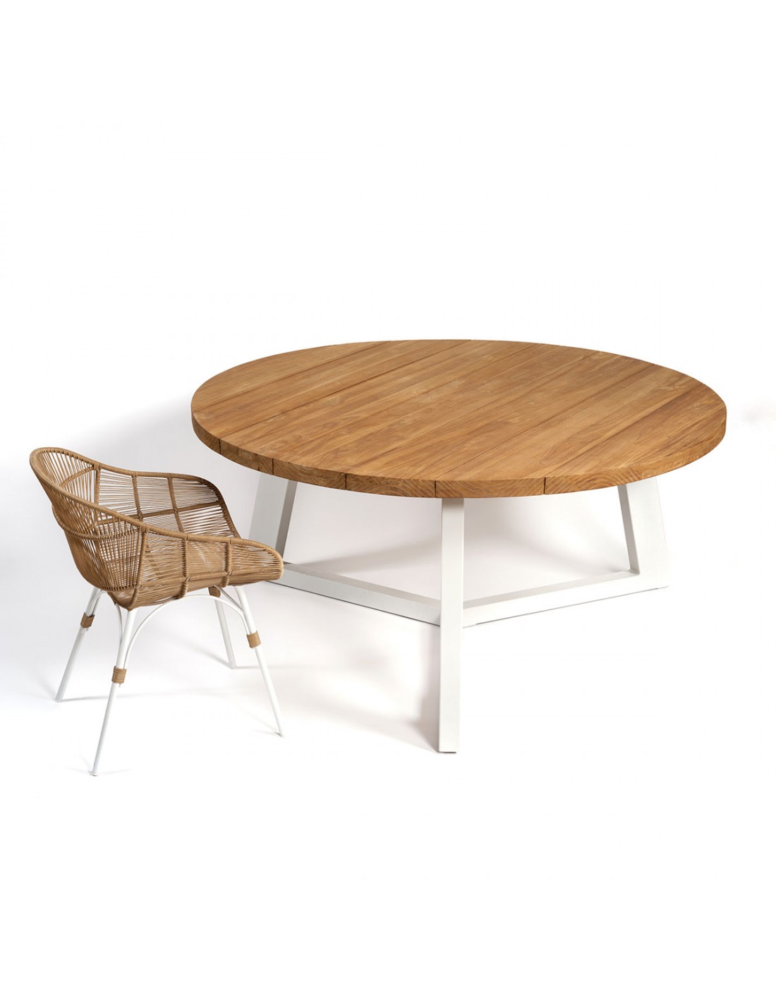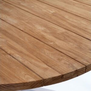 Mesa de comedor para exterior. Mesa de teca y pata de aluminio color piedra. Una mesa redonda con tablero color natural y pata con líneas geométricas en color claro.