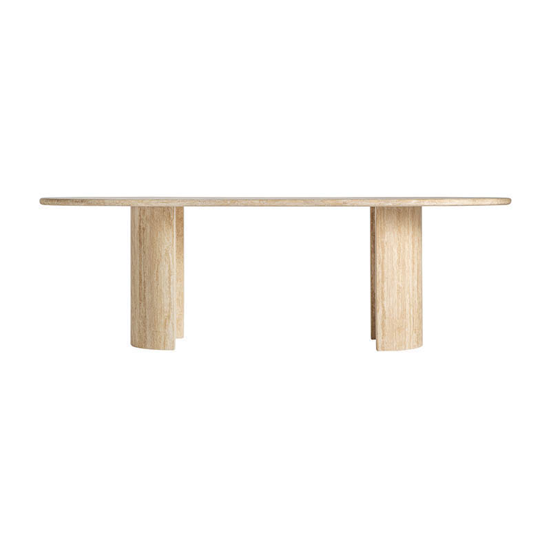 Mesa comedor thiennes de estilo art deco fabricado en travertino en color marrón claro. Producto desmontable.