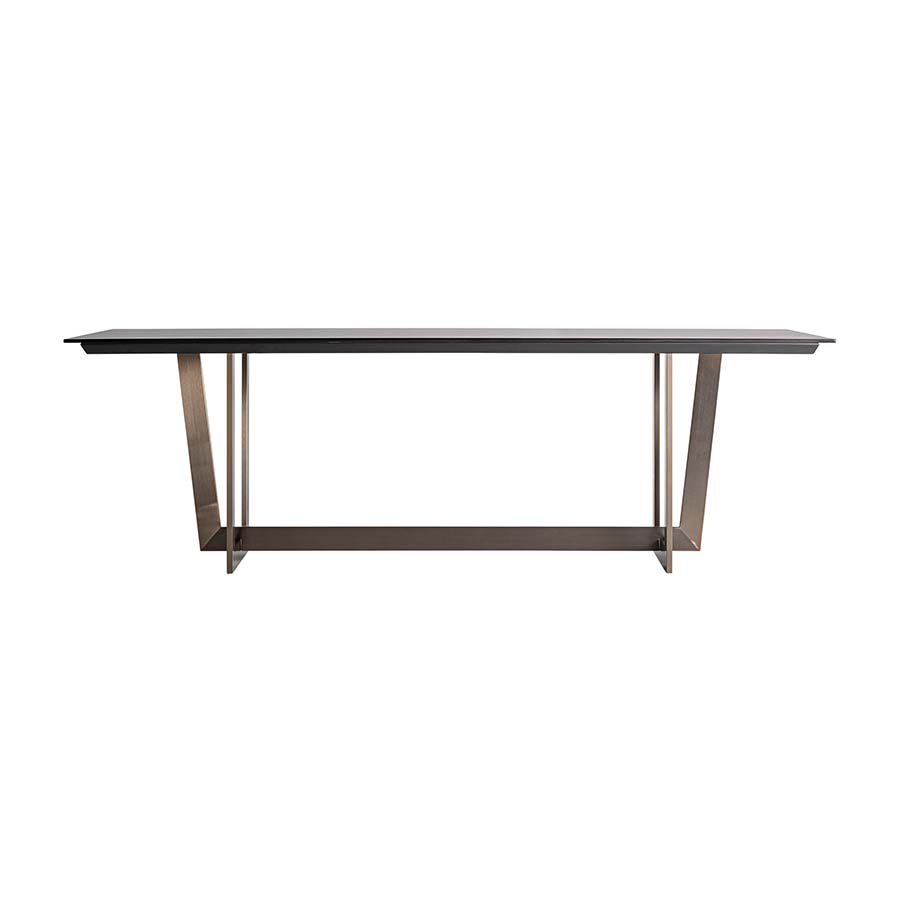 Mesa comedor tremp de estilo art deco fabricado en porcelánico en color negro cobre combinado con acero inoxidable en color oro. Producto desmontable.