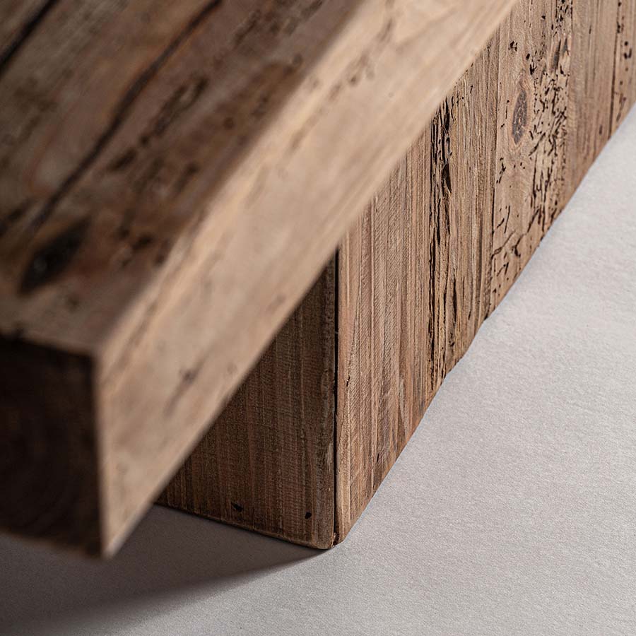 Mesa de centro breive de estilo rústico. Fabricado en madera de pino reciclado en color marrón envejecido. Producto desmontable.