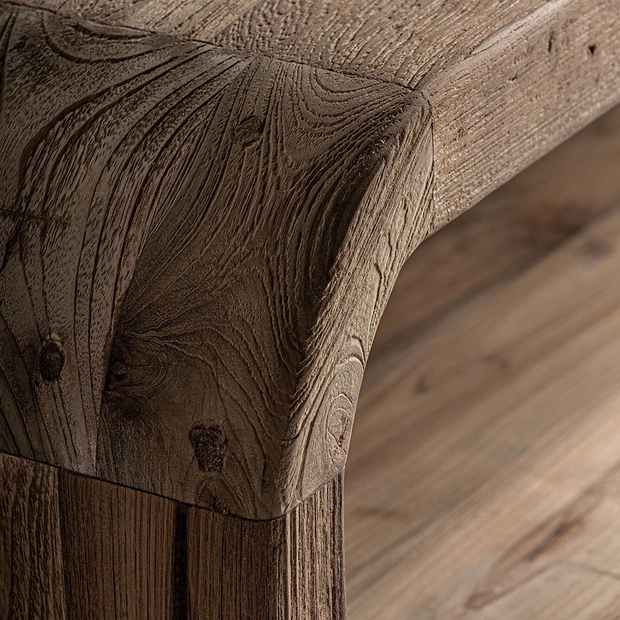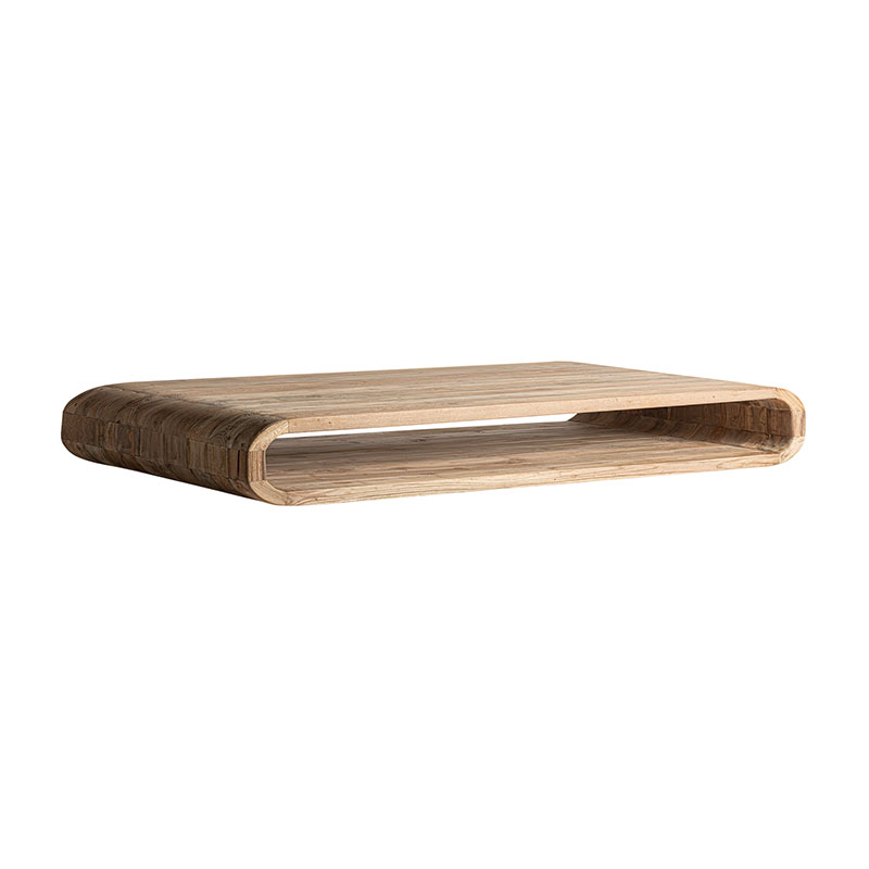 Mesa de centro corba de estilo colonial fabricado en madera de teka reciclada en color marrón con acabado natural.