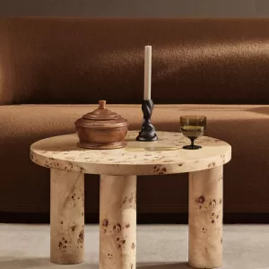En una actualización de nuestro diseño de mesa de centro Post, esta versión hace una declaración audaz con su acabado de madera de raíz bellamente estampada. Manteniendo el espíritu de brutalismo que inspiró el diseño original, juega con las formas para presentar una forma redonda cautivadora. Esta distintiva mesa está elaborada con chapa de nudosa certificada FSC™ con un núcleo de MDF, que combina la geometría simple de la mesa con las ricas texturas de la madera de nudoso. Sus tres robustas patas cilíndricas continúan sosteniendo el diseño, haciendo de esta mesa no solo una pieza funcional sino una adición llamativa a cualquier espacio.
