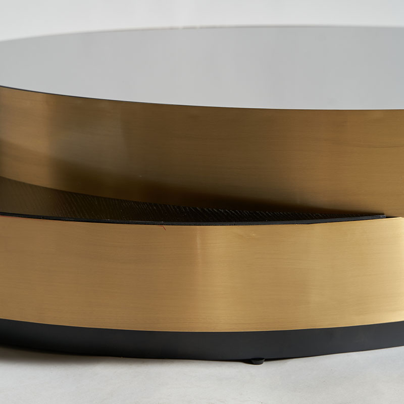 Mesa de centro grein de estilo art deco, fabricado en acero en color negro, combinado con vidrio en color oro y madera. Producto desmontable.