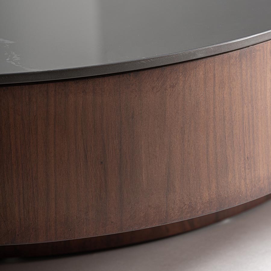 Mesa de centro Neufs de estilo contemporáneo fabricado en mármol sintético en color negro combinado con madera contrachapada en color marrón y chapa de nogal.