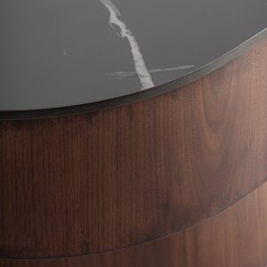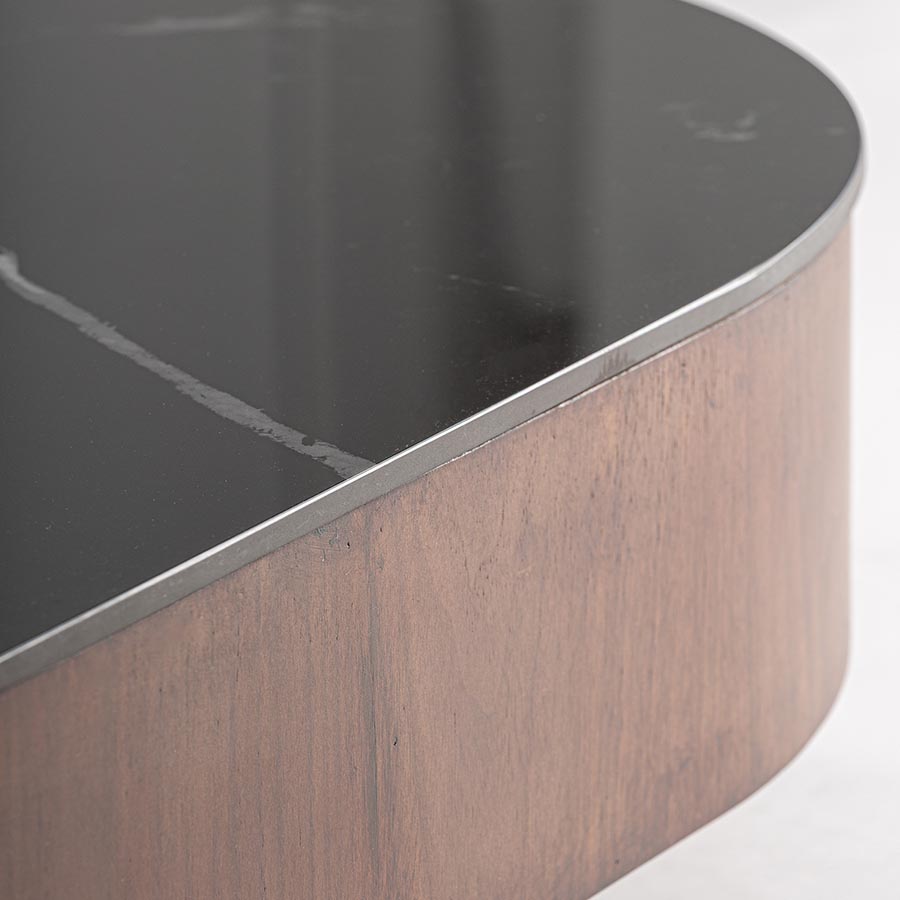 Mesa de centro Neufs de estilo contemporáneo fabricado en mármol sintético en color negro combinado con madera contrachapada en color marrón y chapa de nogal.