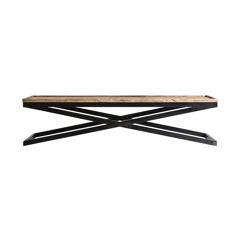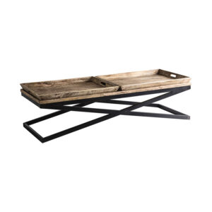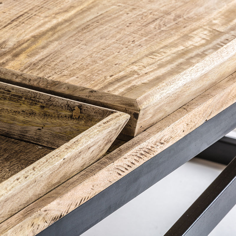 Mesa de centro Newak de estilo industrial fabricado en hierro en color negro con acabado envejecido combinado con madera de mango en color natural. Producto desmontable.