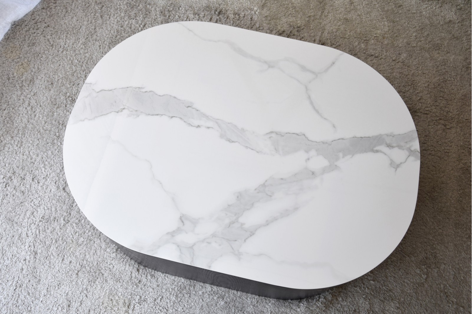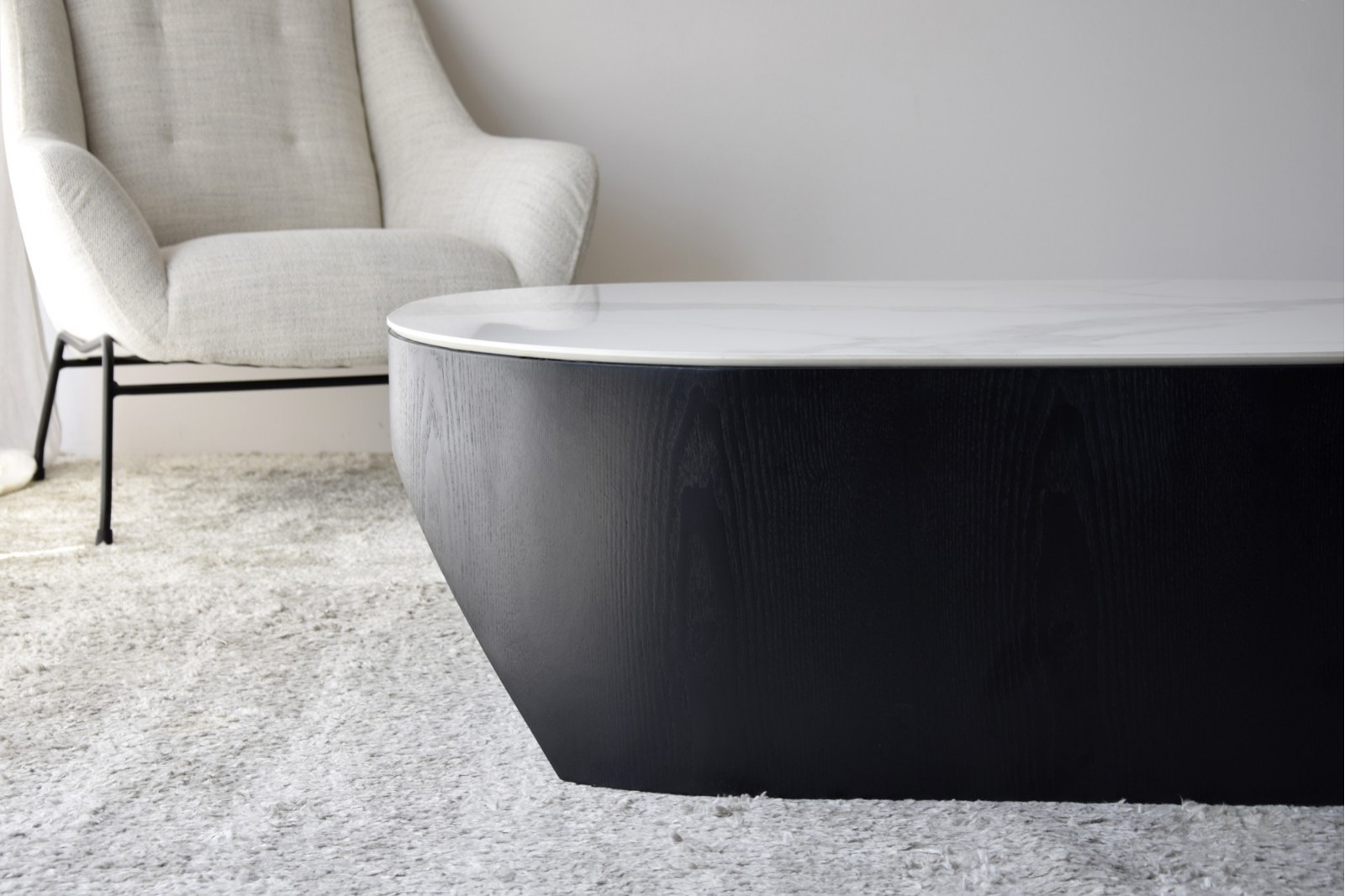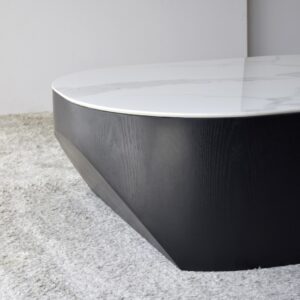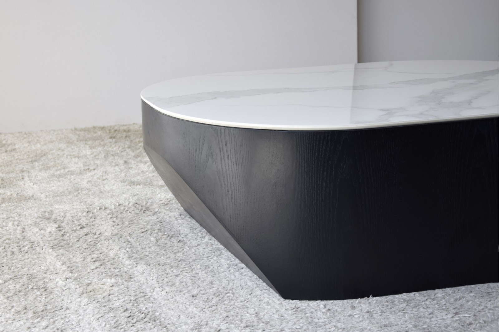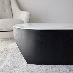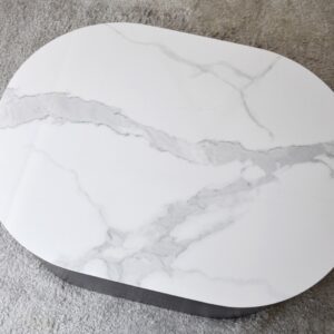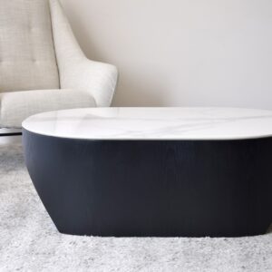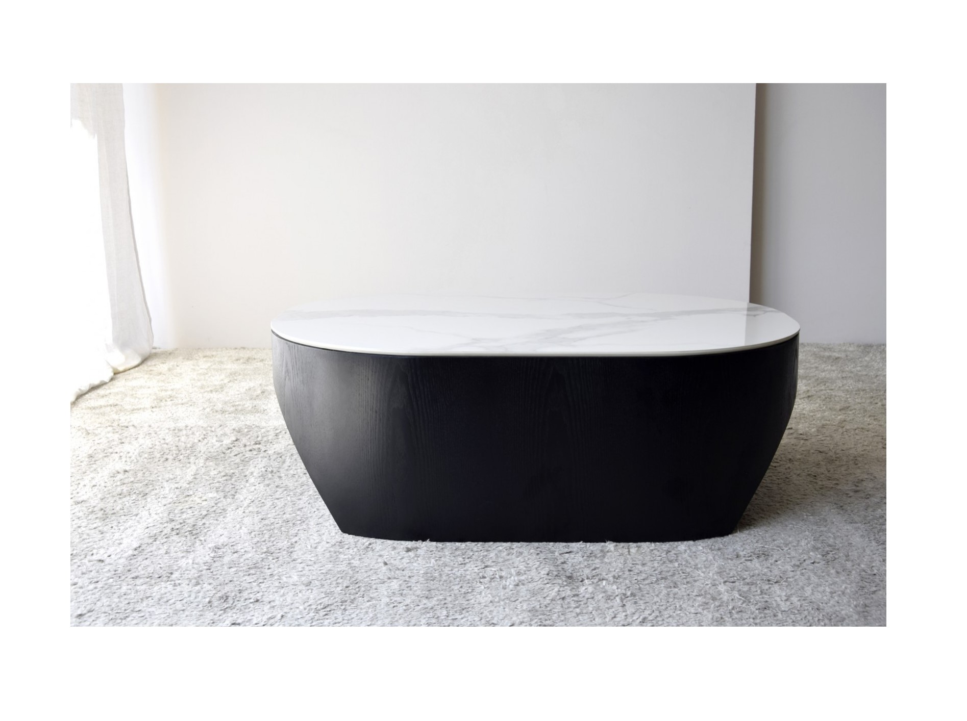 MESA DE CENTRO NORA. SOBRE REALIZADO EN MATERIAL CERÁMICO DE 12 MM DE ESPESOR DE ACABADO MÁRMOL EN COLOR BLANCO VETEADO EN TONOS GRISES. LA BASE ESTÁ FORMADA POR UNA PIEZA MACIZA DE FORMA OVALADA ALIGERADA POR UN REBAJE PRACTICADO EN LOS EXTREMOS EN FORMA DE ARCO LO QUE APORTA CIERTO MOVIMIENTO A LA PIEZA. REALIZADA EN DM RECHAPADO EN FRESNO NATURAL TEÑIDO EN COLOR NEGRO DE ACABADO MATE. LOS TONOS Y PATRONES DEL MATERIAL UTILIZADO EN EL SOBRE PUEDEN SER DIFERENTES DE UNAS PIEZAS A OTRAS.CERÁMICO N1
