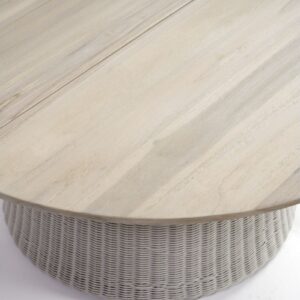 Mesa de centro redonda para exterior de madera de teca envejecida blanqueada y pata central redondda en ratán sintético en tono gris claro. Combina con nuestro modelo ARIA-2 de mesa auxiliar o nuestra mesa de comedor ARIA