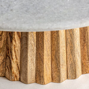 Mesa de centro plissé wood de estilo art deco fabricado en madera de mango en color blanco combinado con mármol en color natural. Limpiar rápidamente la superfície del mármol si se mancha para evitar marcas. Producto desmontable.