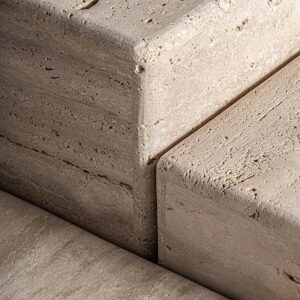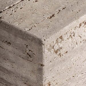 Mesa de centro Rapolano de estilo art deco fabricado en travertino en color beige.
