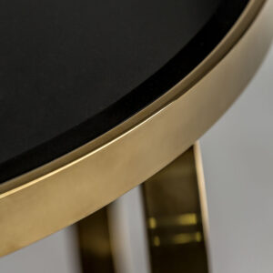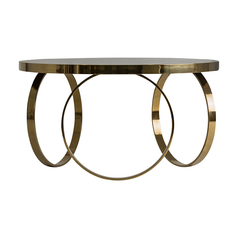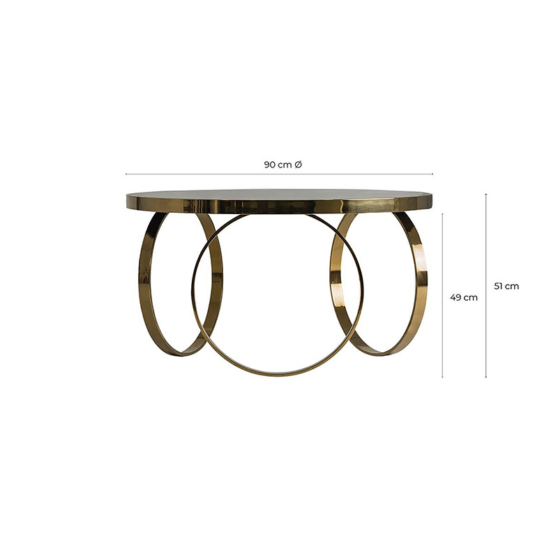 Mesa de centro reda en color oro brillo de estilo art deco. Fabricado en espejo combinado con madera dm y acero. Producto desmontable.