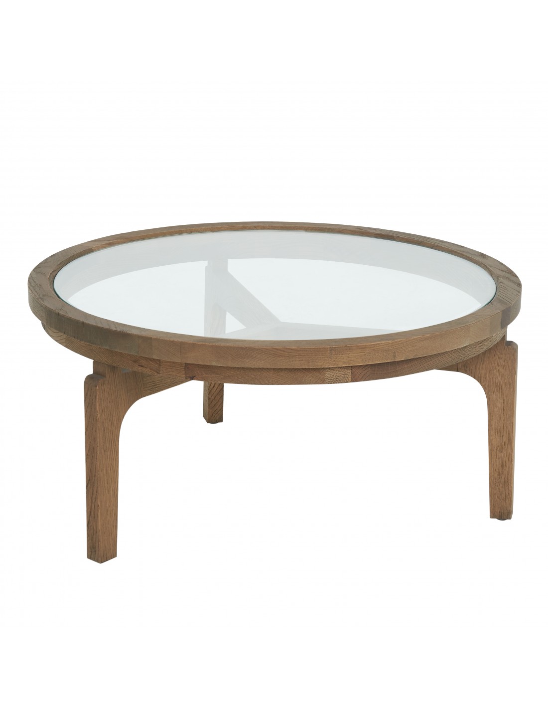 Mesa de centro redonda con madera de roble natural y cristal transparente. Ideal para hacer set para amplios espacios de sofás con otros tamaños de la colección MOREI. Líneas curvas para espacios sofisticados.