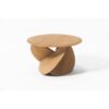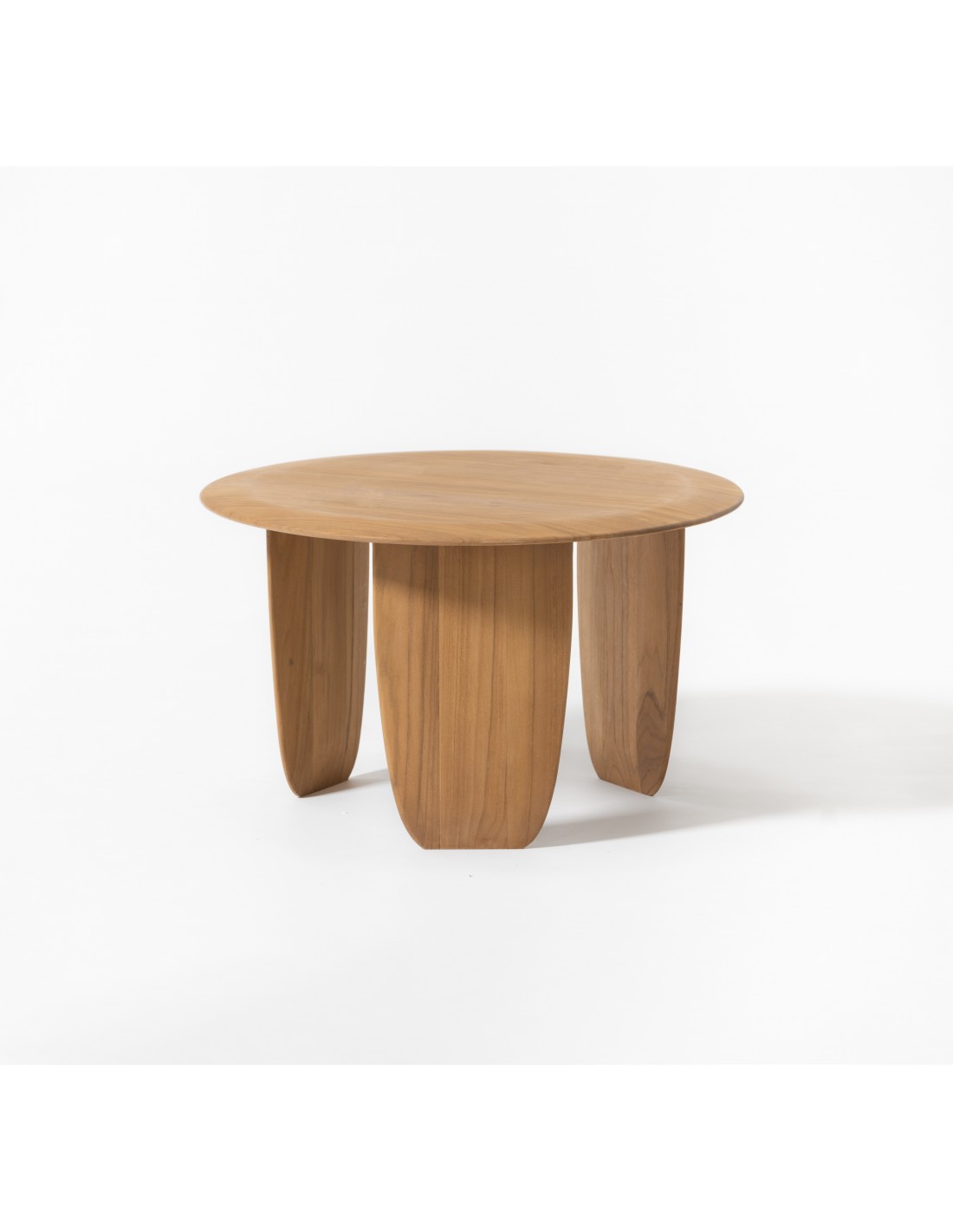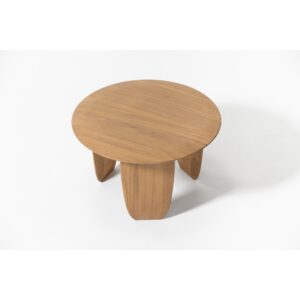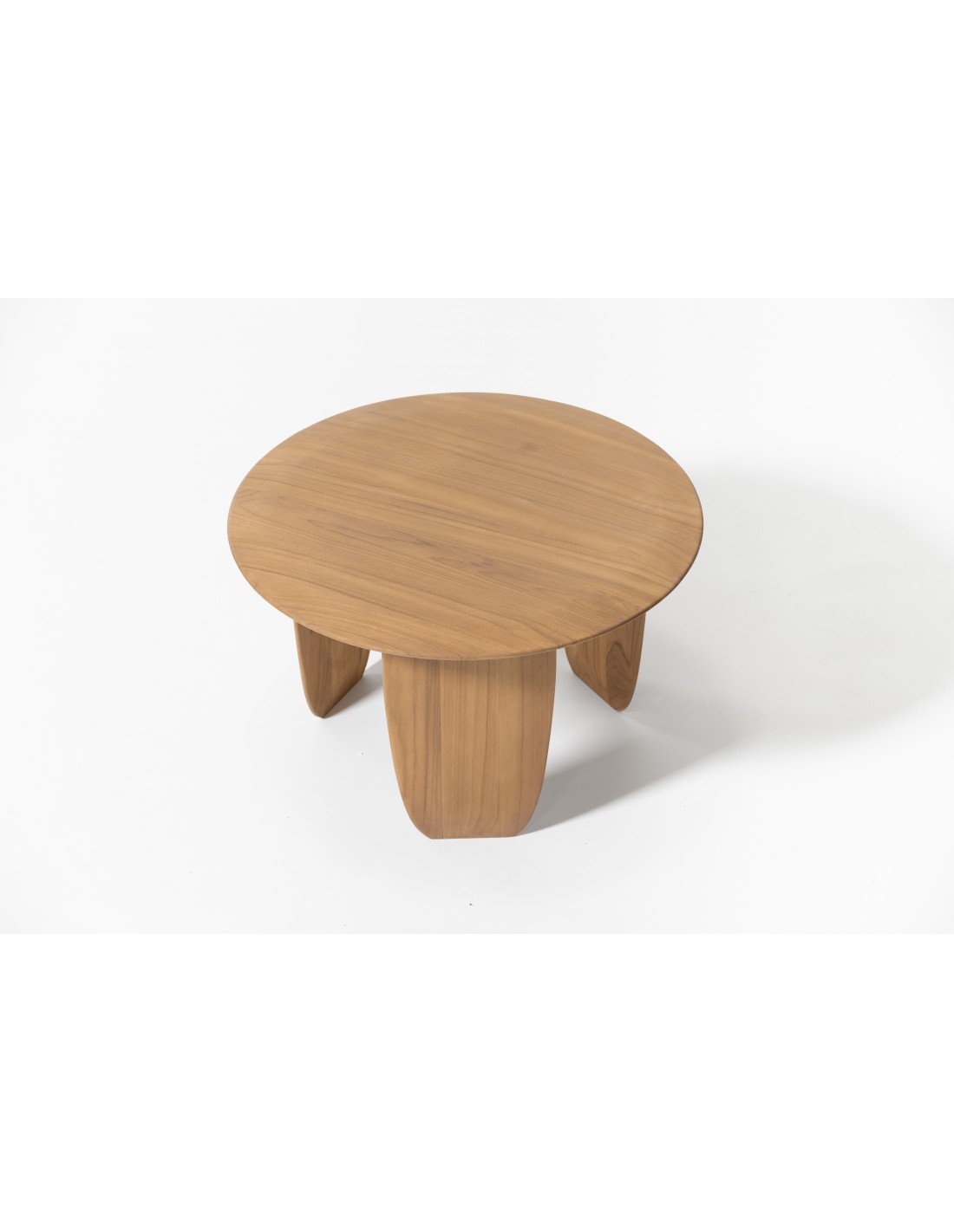 Mesa de centro redonda de madera de teca en tono natural con 3 originales tableros como estructura de patas. Una pieza con personalidad, para ambientes que destacan por su sencillez y elegancia.