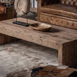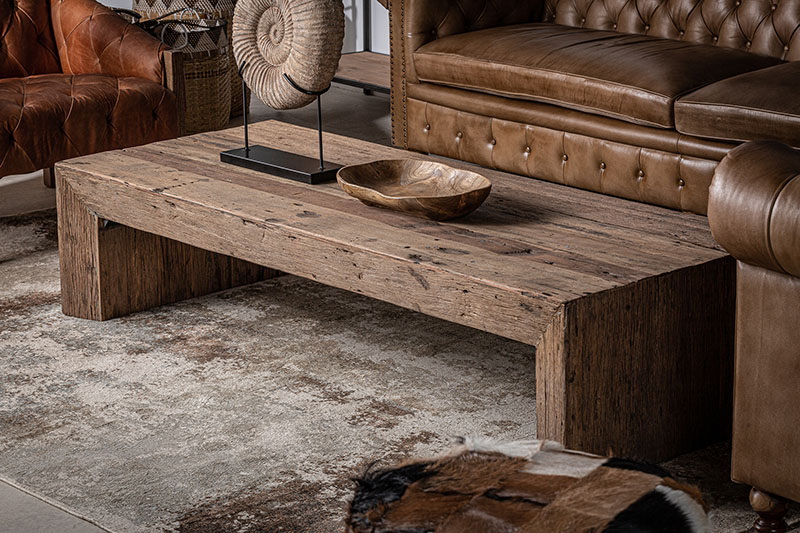 Mesa de centro samsun de estilo étnico fabricado en madera recuperada en color marrón con acabado envejecido. Varias maderas: pino mango teka acacia.