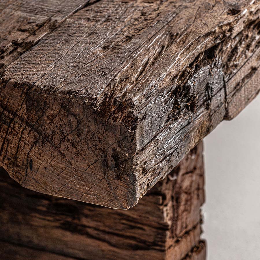 Mesa de centro sliven de estilo étnico fabricado en madera de teka en color marrón con acabado envejecido.