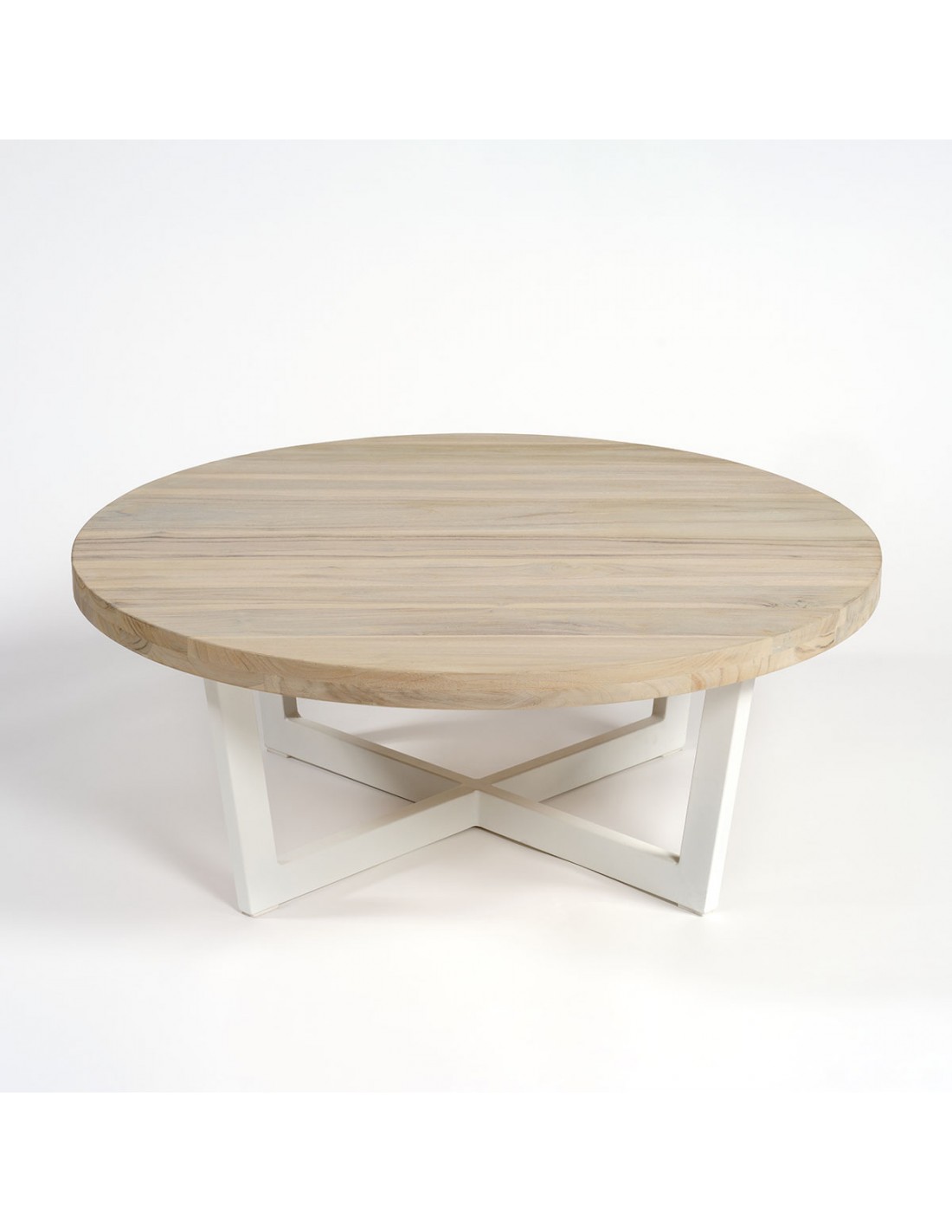 Mesa de centro redonda con tapa de madera de teca envejecida blanqueada y pata de aluminio en color gris claro. Combinación ideal con nuestros modelos de mesas de comedor como JOEL o JOEL-S y auxiliares de teca envejecida blanqueada, como el modelo ILIA-S. Apta para uso exterior.