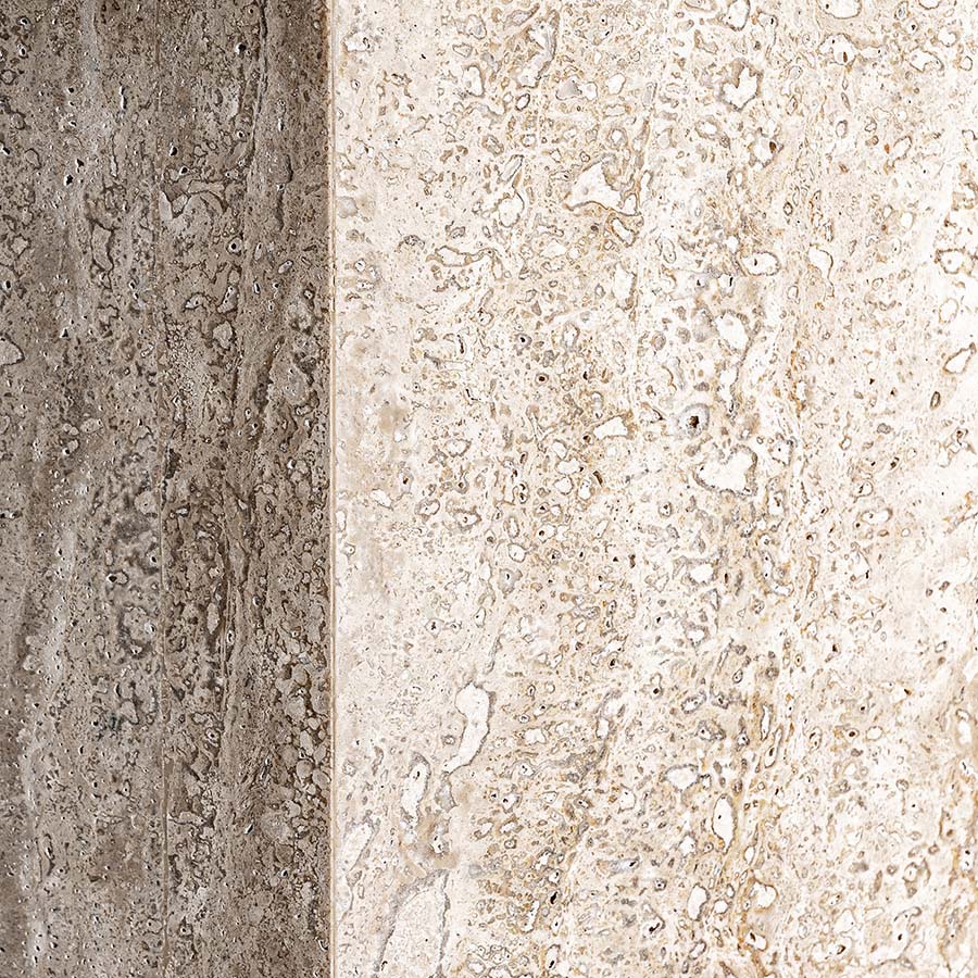 Mesa de centro Thiennes de estilo art deco fabricado en travertino en color marrón claro combinado con cristal en color ambar.