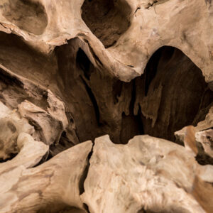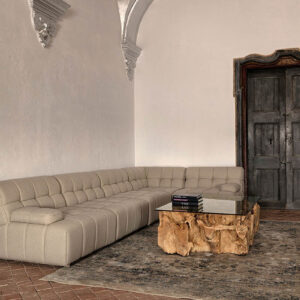 Mesa de centro waary de estilo étnico fabricado en raíz teka en color marrón con acabado envejecido combinado con vidrio. Producto desmontable.