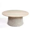 Mesa de comedor para exterior redonda con tablero de madera de teca envejecida y pie central redondo de ratán sintético en color gris claro. Combínala con nuestra colección de sillas para exterior en estos tonos o en maderas de eucalipto y cuerda.