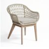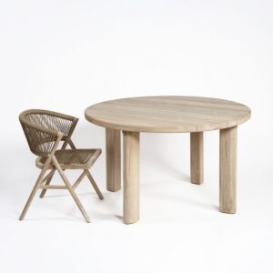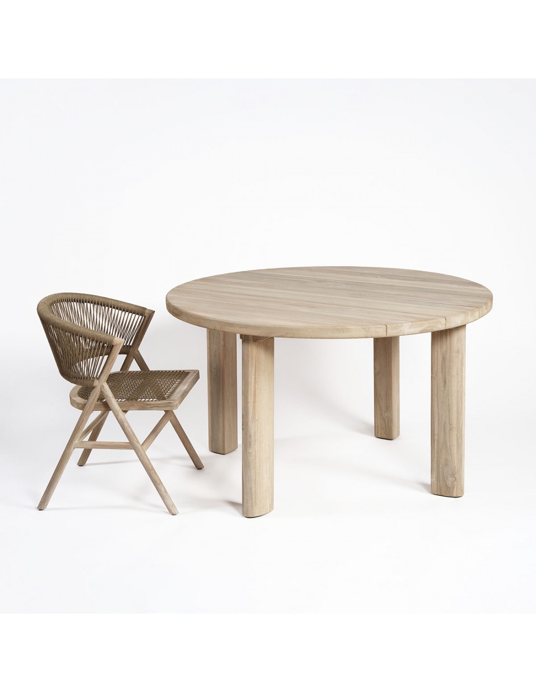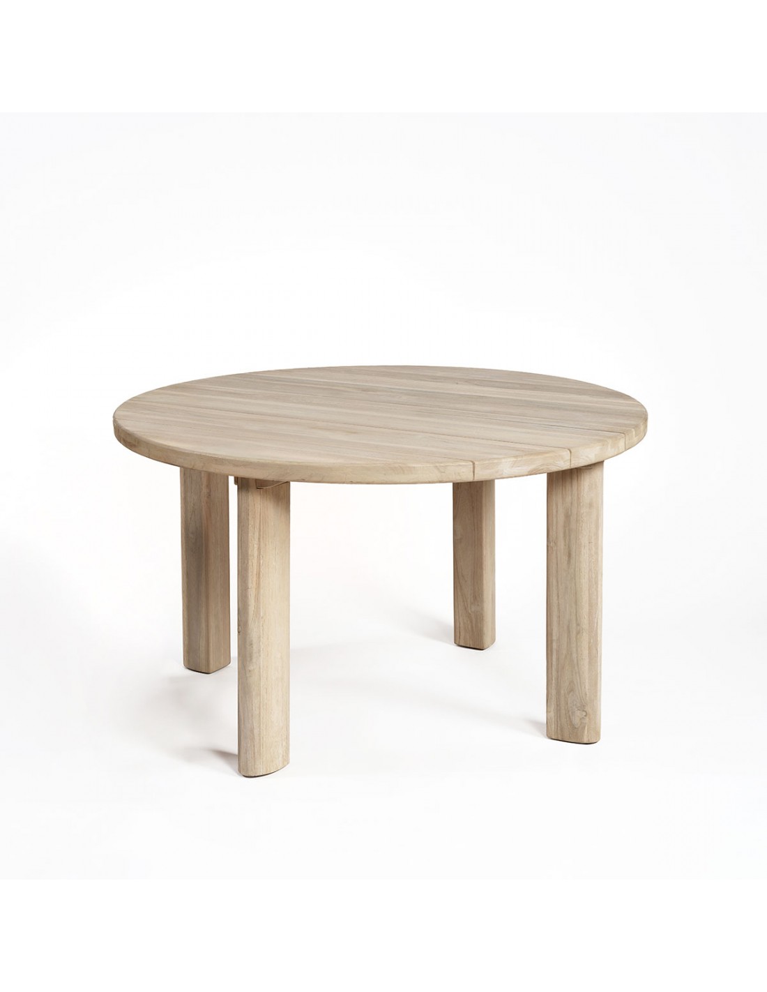 Mesa de comedor redonda para exterior fabricada con madera de teca envejecida. Cuenta con 4 patas en la misma madera. Es apta para exterior, jardín o porche.