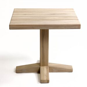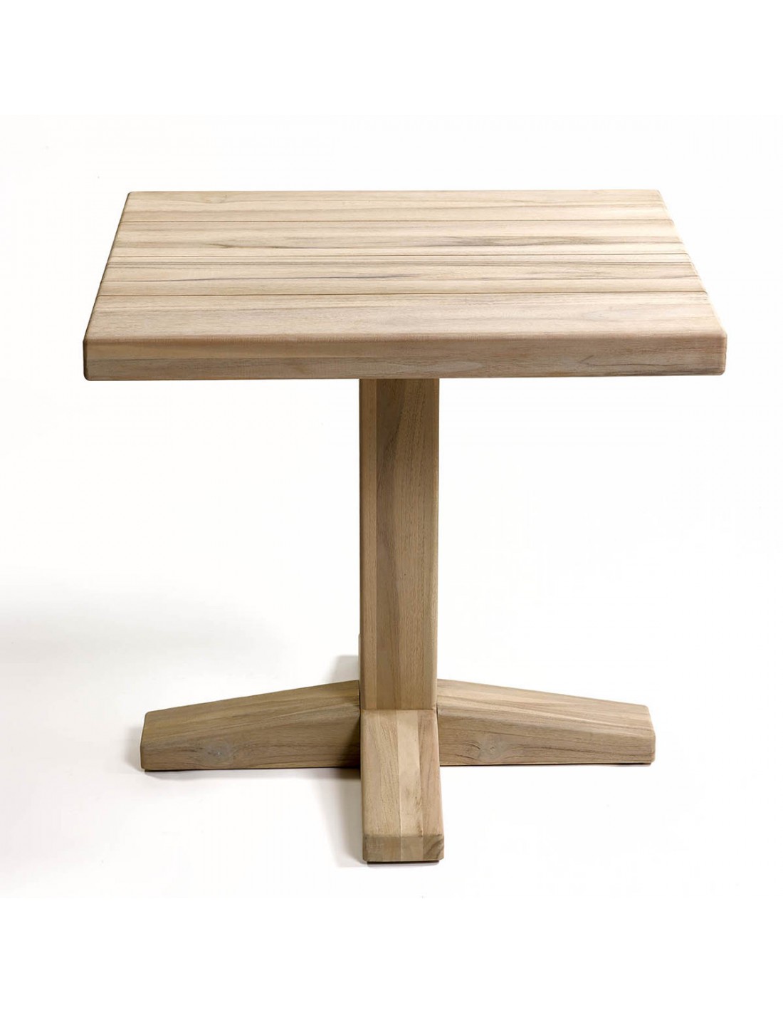 Mesa de madera de teca para exterior con forma cuadrada. Pie central con base de 4 apoyos también en la misma madera teca envejecida.