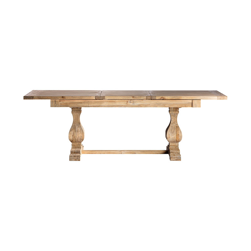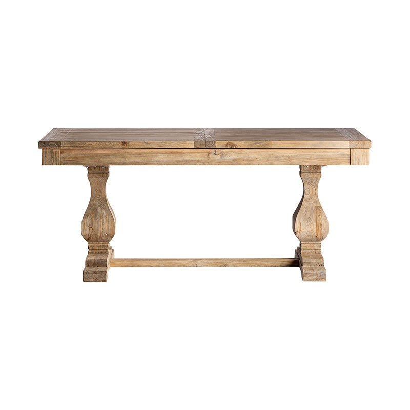 Mesa extensible Berca de estilo clásico fabricado en madera de olmo reciclado en color marrón. Madera proveniente de antiguas puertas por lo que puede haber imperfecciones. . Producto desmontable extensible.