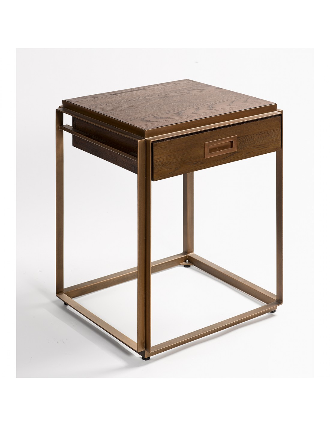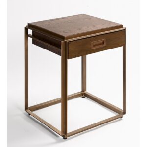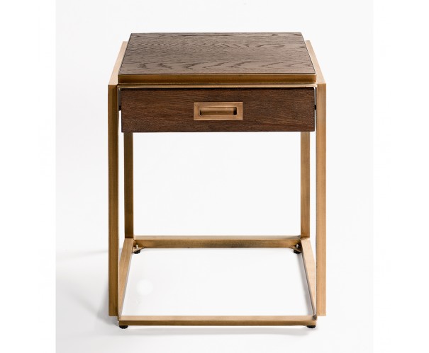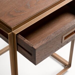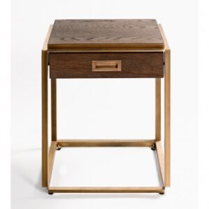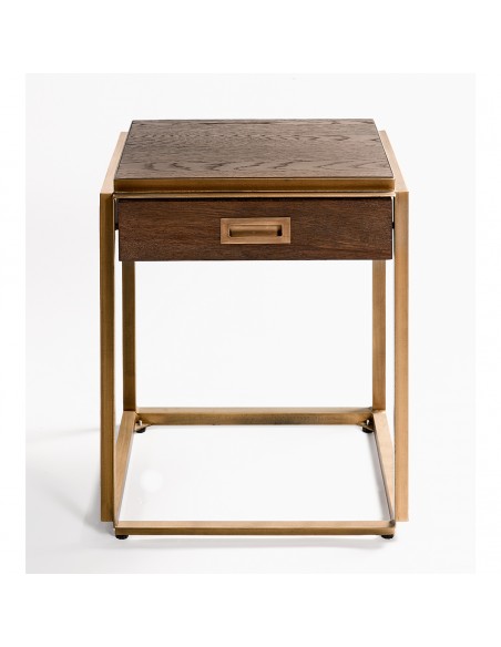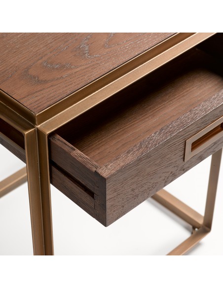 Os presentamos esta estupenda mesa auxiliar o de noche, que causará sensación en un dormitorio contemporáneo o vintage. Líneas rectas y depuradas, con base de metal dorado, que le aportan un estilo moderno y aéreo. Caja de madera de roble. Mesa realmente glamurosa, que evoca los muebles de los años locos. Gracias a su tamaño, esta mesa de noche encajará de maravilla en los espacios reducidos.