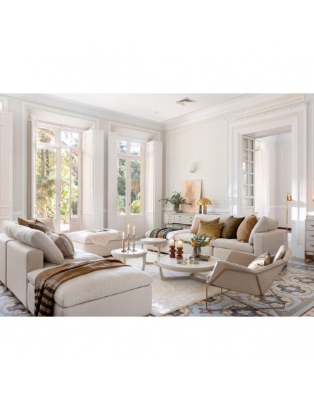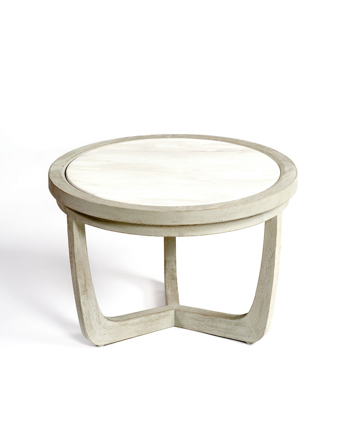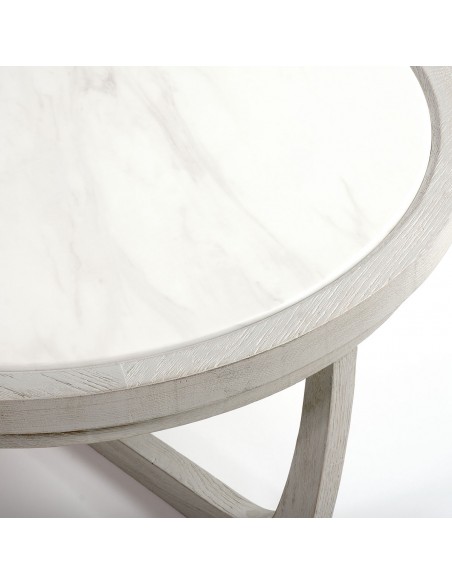Mesa auxiliar mediana de madera de roble en color blanco grisáceo y piedra blanca. Es combinable con otros modelos de la colección ARIANA en diferentes tamáños y proporciones para formar un set. El color depende de la luz de la estancia.