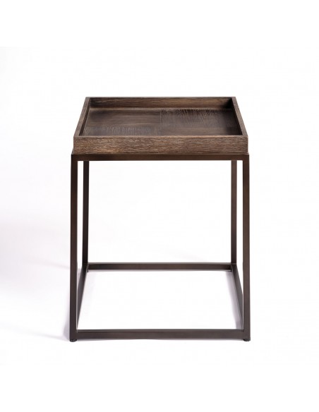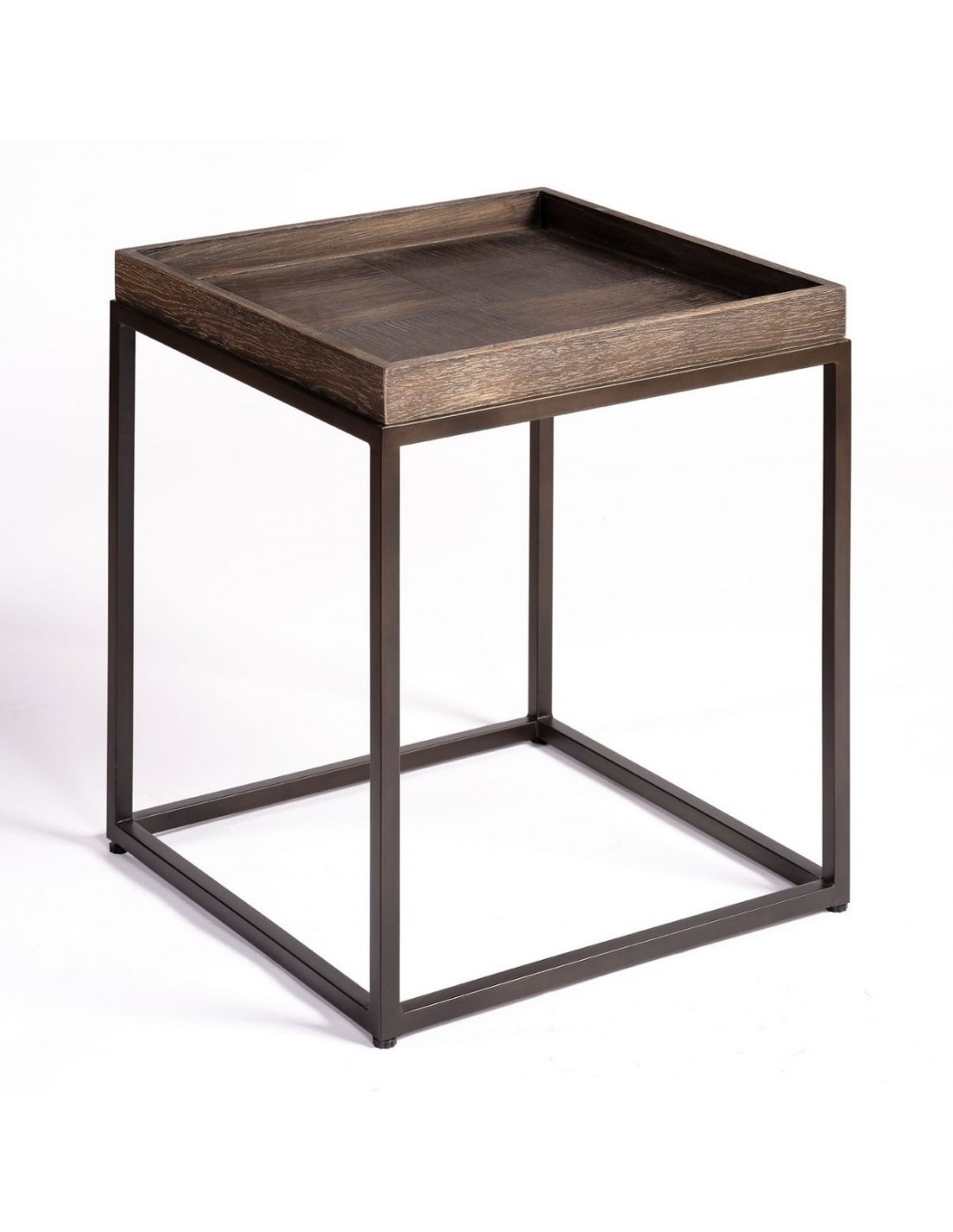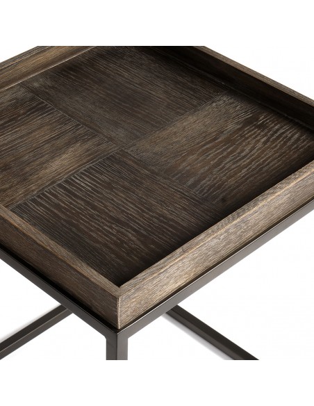 Mesa auxiliar de madera de roble en tono grisáceo con estrucutra metálica en color negro. El sobre presenta bordes altos formando un pequeño marco en todo el perímetro. La madera está tallada realizando un dibujo a cuadros