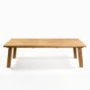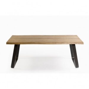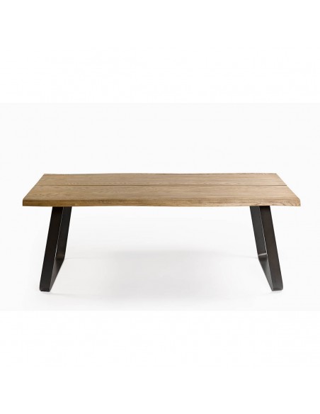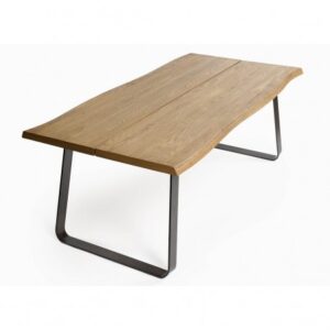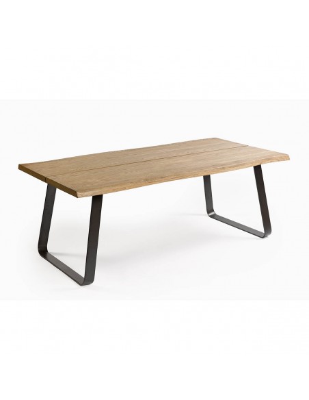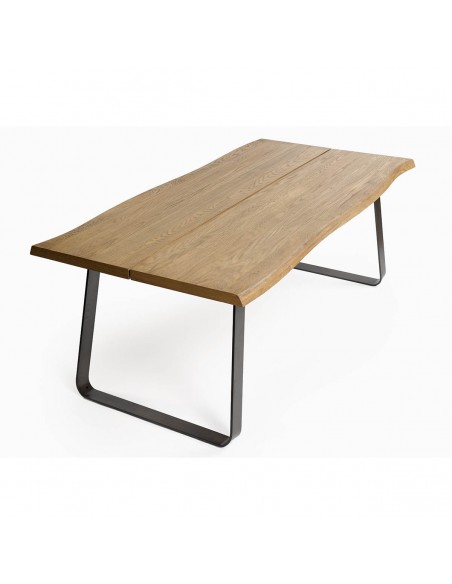 Mesa de comedor de roble abertura central en el tablero. Las patas de metal con diseño cuadrado le aportan líneas y rectas y geométricas además de resultar muy cómoda para combinarla con cualquier tipo de silla ya que las patas son laterales y huecas, lo que permite el máximo aprovechamiento de tu espacio.