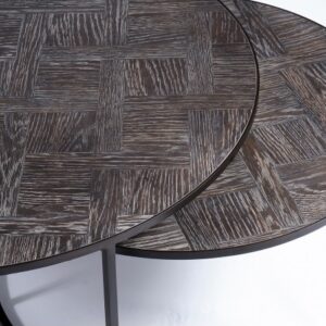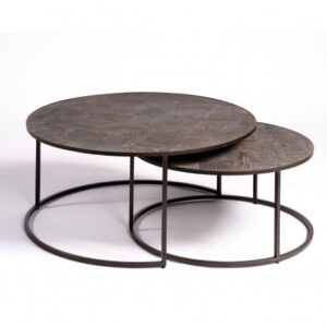 Set de dos mesas redondas de madera de roble color grisáceo y pata metálica en color negro. También disponible en tono blanco grisáceo con metal dorado. Diseño minimalista y moderno tipo nido con el que podrás aprovechar mucho mejor el espacio gracias a su forma redonda que hace que visualmente ocupen menos espacio pero tangan una amplia superficie de apoyo.