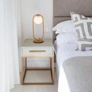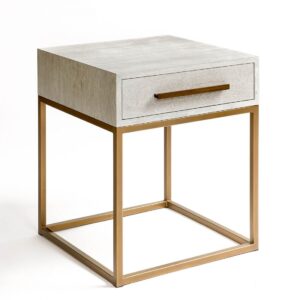 Mesita de noche de roble color blanco grisáceo patinado con estructura metálica dorado envejecido. Mesita de noche con cajón. Pieza con lineas rectas y cuidadas.