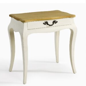 Mesita de noche con estructura de madera acabada en roble con un cajón. El sobre de la mesa es de cristal templado.