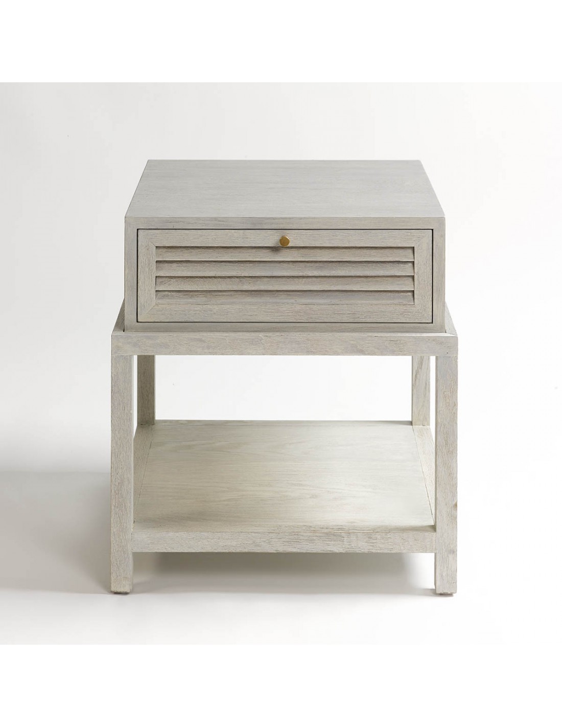 Mesita de noche con acabado en roble color claro blanco patinado. Tiene un cajón con el acabado frontal en persianilla y estructura completa de madera tanto la base como el sobre y el cajón.