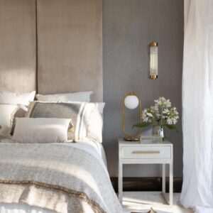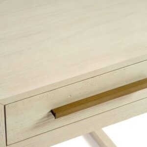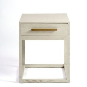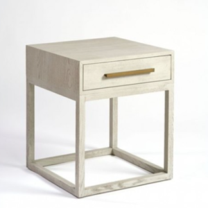Mesita de noche con acabado en roble en tono blanco grisáceo. Cuenta con un cajón en la parte superior y estructura de madera abierta para la base, aportando líneas sencillas y poco cargadas a la habitación.