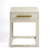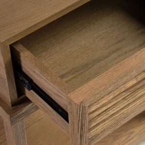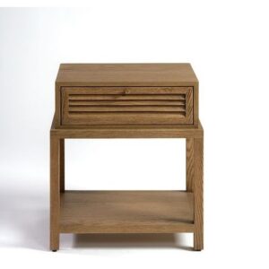Mesita de noche con acabado en roble color natural. Tiene un cajón con el acabado frontal en persianilla y estructura completa de madera tanto la base como el sobre y el cajón.